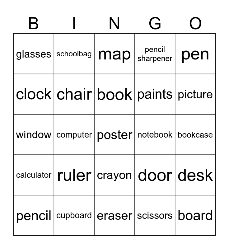 This bingo card has 25 words: ruler, eraser, book, pencil, pen, glasses, clock, schoolbag, notebook, crayon, paints, window, door, desk, chair, board, bookcase, map, picture, computer, poster, cupboard, calculator, pencil sharpener and scissors.
