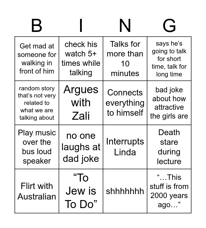 This bingo card has 16 words: “To Jew is To Do”, Death stare during lecture, Talks for more than 10 minutes, Get mad at someone for walking in front of him, Play music over the bus loud speaker, check his watch 5+ times while talking, Interrupts Linda, shhhhhhh, random story that’s not very related to what we are talking about, Argues with Zali, Flirt with Australian, says he’s going to talk for short time, talk for long time, no one laughs at dad joke, bad joke about how attractive the girls are, Connects everything to himself and “…This stuff is from 2000 years ago…”.