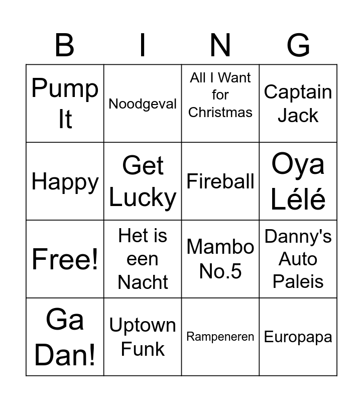 This bingo card has 20 words: Ga Dan!, Rainbow in the sky, All I Want for Christmas, Danny's Auto Paleis, 99 Luftballons, Het is een Nacht, Rampeneren, Captain Jack, Free!, Noodgeval, Mambo No.5, Oya Lélé, Pump It, Uptown Funk, Fireball, Billie Jean, Happy, Get Lucky, Murder on the Dance Floor and Europapa.