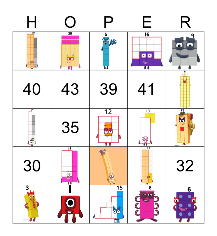 This bingo card has 29 images, a free space and 15 words: 30, 31, 32, 33, 34, 35, 36, 37, 38, 39, 40, 41, 42, 43 and 44.