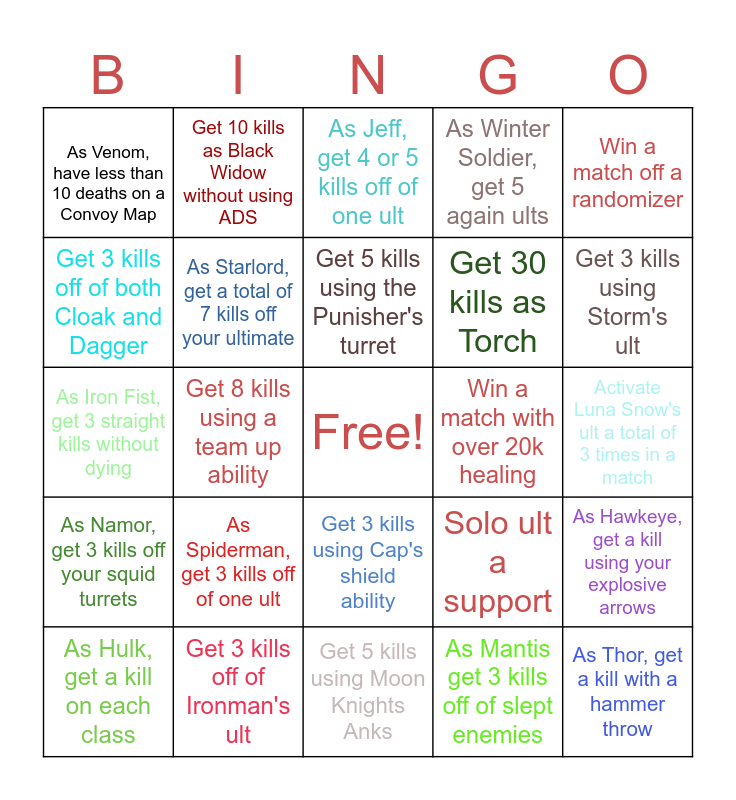 This bingo card has a free space and 24 words: As Spiderman, get 3 kills off of one ult, Get 3 kills off of Ironman's ult, Get 5 kills using the Punisher's turret, As Hulk, get a kill on each class, Win a match off a randomizer, As Venom, have less than 10 deaths on a Convoy Map, Get 3 kills off of both Cloak and Dagger, Get 10 kills as Black Widow without using ADS, Win a match with over 20k healing, Get 3 kills using Cap's shield ability, Get 30 kills as Torch, As Iron Fist, get 3 straight kills without dying, Solo ult a support, As Hawkeye, get a kill using your explosive arrows, As Starlord, get a total of 7 kills off your ultimate, As Mantis get 3 kills off of slept enemies, Activate Luna Snow's ult a total of 3 times in a match, As Jeff, get 4 or 5 kills off of one ult, Get 3 kills using Storm's ult, Get 8 kills using a team up ability, As Thor, get a kill with a hammer throw, As Namor, get 3 kills off your squid turrets, As Winter Soldier, get 5 again ults and Get 5 kills using Moon Knights Anks.