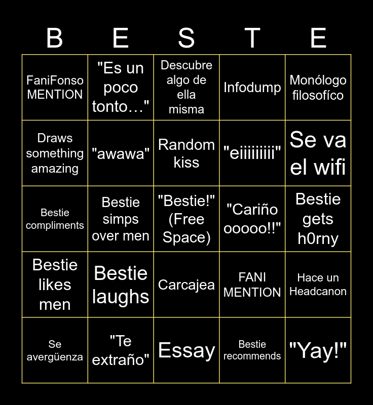 This bingo card has a free space and 29 words: "Estás enfadado conmigo?", "Te extraño", Descubre algo de ella misma, FANI TANGENT, Monólogo filosofíco, FaniFonso MENTION, "awawa", Random kiss, "Cariño ooooo!!", Hace un Headcanon, Se avergüenza, Bestie simps over men, Bestie recommends, "Yay!", Bestie compliments, Bestie se pone emocional, Essay, FANI MENTION, Se va el wifi, Bestie likes men, Bestie laughs, "Que tal tu día?", "eiiiiiiiii", Bestie gets h0rny, Draws something amazing, "Es un poco tonto…", Carcajea, Infodump and Flirts.