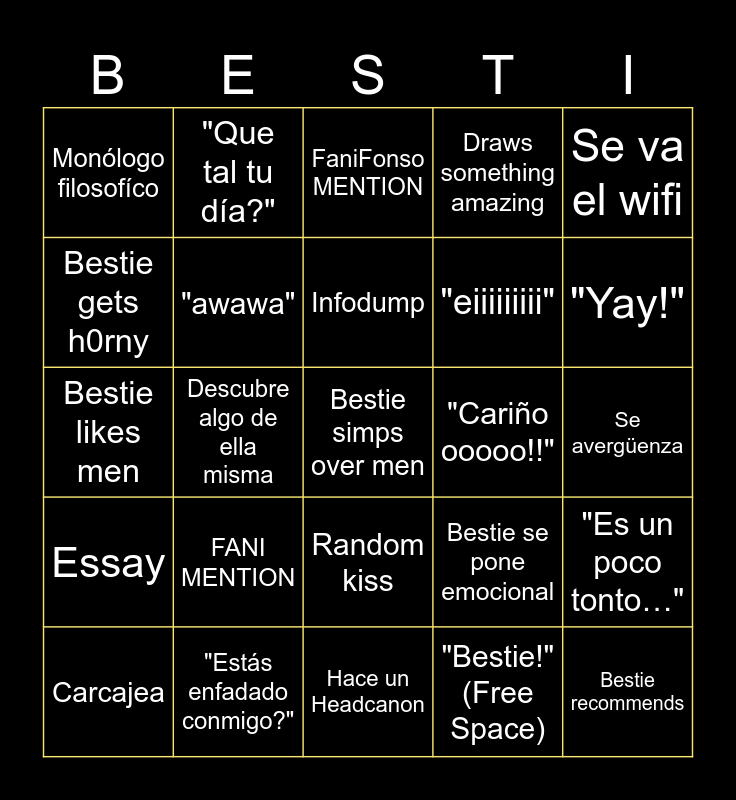 This bingo card has 30 words: "Estás enfadado conmigo?", "Te extraño", Descubre algo de ella misma, FANI TANGENT, Monólogo filosofíco, FaniFonso MENTION, "awawa", Random kiss, "Cariño ooooo!!", Hace un Headcanon, Se avergüenza, Bestie simps over men, "Bestie!" (Free Space), Bestie recommends, "Yay!", Bestie compliments, Bestie se pone emocional, Essay, FANI MENTION, Se va el wifi, Bestie likes men, Bestie laughs, "Que tal tu día?", "eiiiiiiiii", Bestie gets h0rny, Draws something amazing, "Es un poco tonto…", Carcajea, Infodump and Flirts.