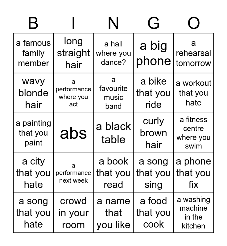 This bingo card has a free space and 24 words: a performance next week, crowd in your room, a favourite music band, a song that you hate, a rehearsal tomorrow, a famous family member, wavy blonde hair, long straight hair, curly brown hair, a book that you read, a bike that you ride, a painting that you paint, a song that you sing, a phone that you fix, a performance where you act, a food that you cook, a fitness centre where you swim, a hall where you dance?, a workout that you hate, abs, a washing machine in the kitchen, a city that you hate, a big phone and a name that you like.