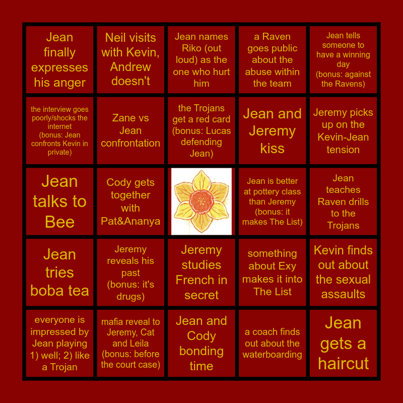 This bingo card has a free space and 24 words: Jeremy reveals his past (bonus: it's drugs), mafia reveal to Jeremy, Cat and Leila (bonus: before the court case), the Trojans get a red card (bonus: Lucas defending Jean), everyone is impressed by Jean playing 1) well; 2) like a Trojan, Jean tells someone to have a winning day (bonus: against the Ravens), Jean finally expresses his anger, the interview goes poorly/shocks the internet (bonus: Jean confronts Kevin in private), Neil visits with Kevin, Andrew doesn't, Jean is better at pottery class than Jeremy (bonus: it makes The List), Jeremy studies French in secret, Jean and Jeremy kiss, Jean talks to Bee, something about Exy makes it into The List, Kevin finds out about the sexual assaults, Zane vs Jean confrontation, a coach finds out about the waterboarding, Jean teaches Raven drills to the Trojans, Jean names Riko (out loud) as the one who hurt him, Jeremy picks up on the Kevin-Jean tension, Cody gets together with Pat&Ananya, Jean gets a haircut, Jean tries boba tea, a Raven goes public about the abuse within the team and Jean and Cody bonding time.