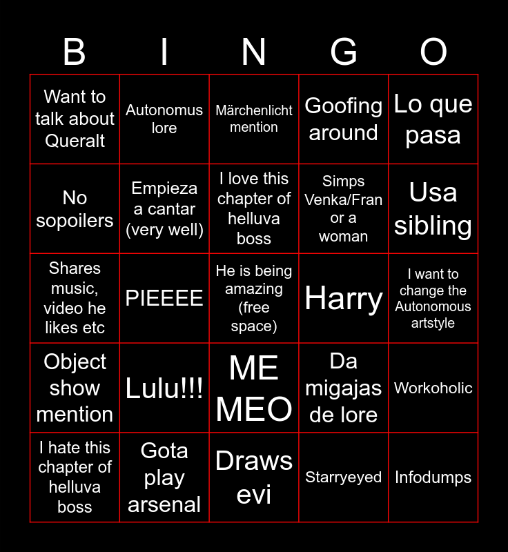 This bingo card has a free space and 24 words: Lulu!!!, Gota play arsenal, I love this chapter of helluva boss, I hate this chapter of helluva boss, Lo que pasa, Want to talk about Queralt, No sopoilers, Autonomus lore, Harry, ME MEO, Simps Venka/Fran or a woman, Shares music, video he likes etc, Da migajas de lore, Workoholic, Empieza a cantar (very well), Starryeyed, I want to change the Autonomous artstyle, Märchenlicht mention, Usa sibling, PIEEEE, Infodumps, Object show mention, Goofing around and Draws evi.