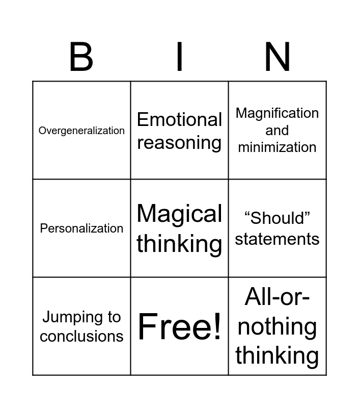 This bingo card has 10 words: Free!, Magnification and minimization, Overgeneralization, Magical thinking, Personalization, Jumping to conclusions, Emotional reasoning, Disqualifying the positive, “Should” statements and All-or-nothing thinking.