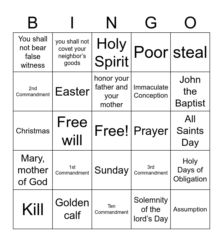 This bingo card has a free space and 24 words: 1st Commandment, Golden calf, honor your father and your mother, Kill, steal, You shall not bear false witness, 2nd Commandment, you shall not covet your neighbor’s goods, Prayer, Sunday, Immaculate Conception, Christmas, 3rd Commandment, Holy Days of Obligation, Easter, Solemnity of the lord’s Day, All Saints Day, Holy Spirit, John the Baptist, Free will, Assumption, Mary, mother of God, Poor and Ten Commandment.