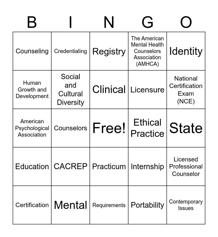 This bingo card has a free space and 24 words: CACREP, Mental, Clinical, Certification, Identity, Counseling, Human Growth and Development, Credentialing, Ethical Practice, Practicum, Licensure, American Psychological Association, Internship, Licensed Professional Counselor, Social and Cultural Diversity, Portability, State, Registry, National Certification Exam (NCE), Counselors, Contemporary Issues, Education, The American Mental Health Counselors Association (AMHCA) and Requirements.