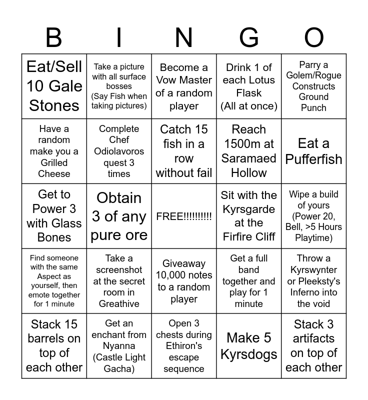 This bingo card has a free space and 24 words: Take a screenshot at the secret room in Greathive, Get an enchant from Nyanna (Castle Light Gacha), Catch 15 fish in a row without fail, Stack 15 barrels on top of each other, Parry a Golem/Rogue Constructs Ground Punch, Eat/Sell 10 Gale Stones, Have a random make you a Grilled Cheese, Take a picture with all surface bosses (Say Fish when taking pictures), Sit with the Kyrsgarde at the Firfire Cliff, Giveaway 10,000 notes to a random player, Reach 1500m at Saramaed Hollow, Get to Power 3 with Glass Bones, Get a full band together and play for 1 minute, Throw a Kyrswynter or Pleeksty's Inferno into the void, Complete Chef Odiolavoros quest 3 times, Make 5 Kyrsdogs, Wipe a build of yours (Power 20, Bell, >5 Hours Playtime), Become a Vow Master of a random player, Eat a Pufferfish, Obtain 3 of any pure ore, Stack 3 artifacts on top of each other, Find someone with the same Aspect as yourself, then emote together for 1 minute, Drink 1 of each Lotus Flask (All at once) and Open 3 chests during Ethiron's escape sequence.