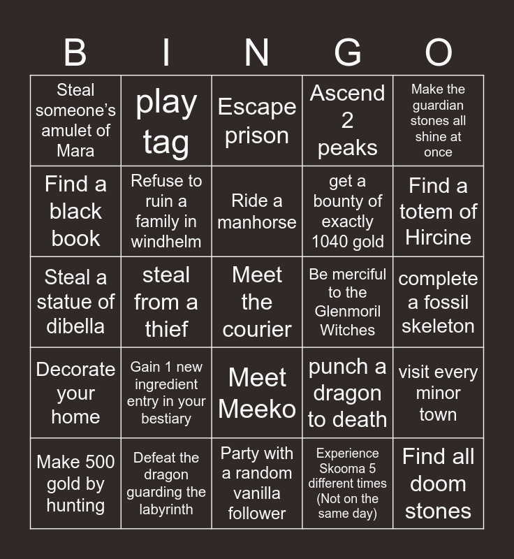 This bingo card has a free space and 140 words: get a dragon claw, punch a jarl, get the golden claw, fight a slaughterfish, cook breakfast, lunch and dinner, punch a dragon to death, shoot a cabbage into a kettle, win a battle of wit, decorate someone elses house, stack 10 cheese wheels ontop of each other, get jailed for a minor crime (below 40 gold), punch a guard in a minor town (Not riverwood), ruin a love triangle, solve a love triangle, kill, fluff or marry Carlotta instead, collect ten different types of alcohol, clear 5 caves, clear 5 nordic ruins, clear 2 dwemer ruins, visit every hold capital, visit every minor town in a hold (Minimum of 2), visit every minor town, kill a giant, kill a mammoth, get space launched, steal from a thief, play tag, play hide and seek, collect 5 different flying insects (alive), collect 5 different insect jars, finish a full display of the Museum (Can be any), do the treasure hunt of the Museum, collect 5 unique fossils, complete a fossil skeleton, complete a shout, collect 10 different shouts, kill 3 dragons, get a bounty of exactly 250 gold, get a bounty of exactly 1040 gold, help a Daedric lord, Get harassed by Thugs, Meet the Madwoman, Meet Meeko, Adopt a child, Get married, Steal Belethor’s sister (His most valuable possession), Bully Lars with Braith, Help Lars against Braith, Beat up a shitty bard in Whiterun, Win 5 brawls, Meet all the different travelling khajiit carevans, Meet Mai’q the Alfiq, Make 500 gold by hunting, Lead a bandit to a guard, Kill 10 rabbits you monster, Get a giant robot Waterlogged, Follow Lessons at the Bard College, Follow lessons at the Mage College, Do 5 radiant quests, Do a special contract for a faction, Boop Paarthurnax on the snoot, Experience Skooma 5 different times (Not on the same day), Go party with Sam and Roleplay the night afterwards, Pretend to be a guard for a shift, Buy a home, Decorate your home, Be mean to a child, Be mean to elderly, Be mean to a beggar, Gift gold to a beggar, Gift gold to 9 different beggars, Steal someone’s amulet of Mara, Steal a statue of dibella, Steal the statue of dibella in the temple, Slay the might Mudcrab boss near Crabby shanty (a dungeon from Ryn), Ascend a peak, Take a leap of faith, Take 3 leaps of faith, Ascend 2 peaks, Explore a forgotten temple (Relics of Hyrule), Discover the Museum (Relics of Hyrule), Find 5 different songs for your ocarina, Make a song about your deeds (Bards college), Make 5 songs about your deeds (Bards college), Find a totem of Hircine, Find all totems of Hircine, Be merciful to the Glenmoril Witches, Be genocidal to the Glenmoril Witches, Party with a random vanilla follower, Get a big group of modded followers, Go camping with a follower, Explore a land below the earth, Find the dragon trapped below the earth, Defeat the dragon guarding the labyrinth, Collect a dragon mask in Skyrim (Not wood), Collect the wooden dragon mask, Collect 3 dragon masks in Skyrim, Collect all dragon masks in Skyrim, Collect a dragon mask in Solstheim, Collect all the dragon masks in Solstheim, Find a black book, Find all black books, Complete your lusty Argonian maid collection, Ride a salmon, Ride a manhorse, Gain 1 new entry in your bestiary (Not ingredients), Gain 5 new entries in your bestiary (Not ingredients), Gain 10 new entries in your bestiary (Not ingredients), Gain a new legendary entry in your bestiary, Gain 1 new ingredient entry in your bestiary, Gain 5 new ingredient entries in your bestiary, Gain 10 new ingredient entries in your bestiary, Make the guardian stones all shine at once, Find all doom stones, Ruin a family in windhelm, Refuse to ruin a family in windhelm, Ruin a persons house, Kill a person in their house, Make the life mildly inconvenient for an NPC, Kill a patrol of soldiers, Kill a patrol of thalmor, Get the blessing of Kyne, Make your deity abandon you, Become a devout of your deity, Fix the gildergreen humanely (Don’ hurt the Eldergleam), Fix the gildergreen inhumanely (Use nettlebane on the eldergleam), Kill sinding and skin him, Refuse Hircine, Fuel the ebony blade to completion, Kill a NPC in plain sight and hide their body without being seen (Reloading is okay), Get shouted off of Snow-Throat mountain, Shout someone off of snow-throat mountain, Adopt a pet, Get naked in a city and run around, Escape the Chill, Escape prison, Escape prison without a secret passageway, Orphan a child and adopt them, Kill Grelod in the funniest way possible and Go baking.
