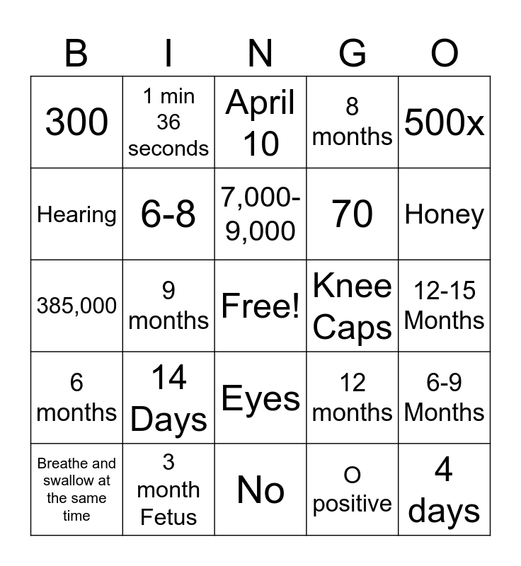 This bingo card has a free space and 24 words: 14 Days, 3 month Fetus, 7,000-9,000, Breathe and swallow at the same time, 500x, 300, Hearing, 1 min 36 seconds, Knee Caps, Eyes, 70, 385,000, 12 months, 6-9 Months, 6-8, O positive, 12-15 Months, April 10, Honey, 9 months, 4 days, 6 months, 8 months and No.
