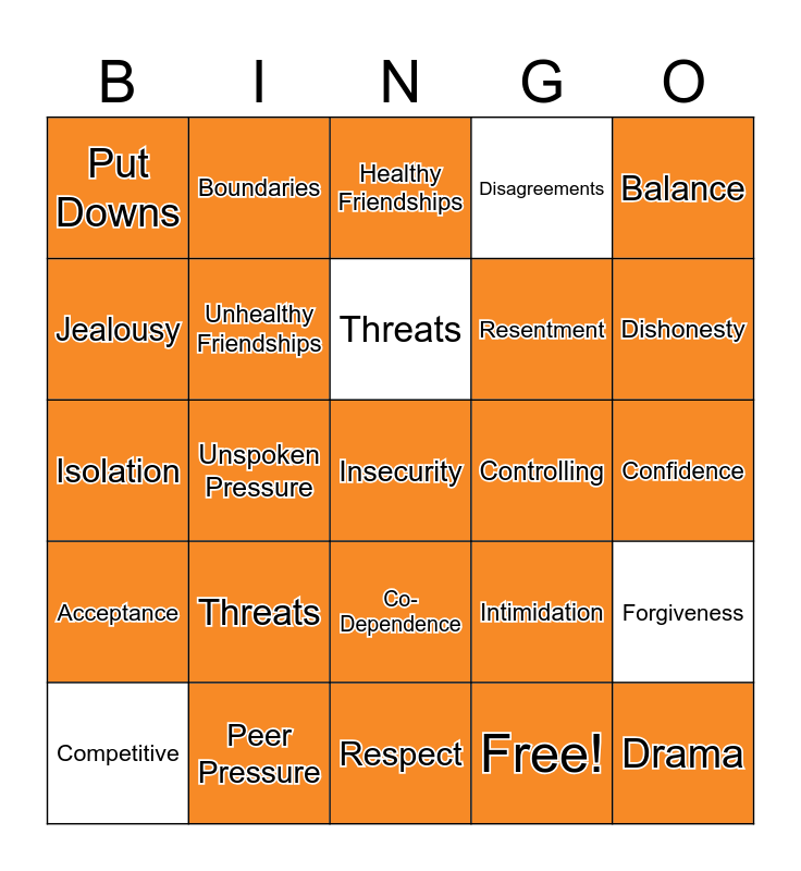 This bingo card has 30 words: Peer Pressure, Spoken Pressure, Unspoken Pressure, Rejection, Put Downs, Healthy Friendships, Unhealthy Friendships, Co-Dependence, Controlling, Respect, Confidence, Insecurity, Free!, Drama, Dishonesty, Loyalty, Intimidation, Acceptance, Threats, Balance, Isolation, Trust, Boundaries, Resentment, Jealousy, Disagreements, Forgiveness, Competitive, Threats and Insecurity.