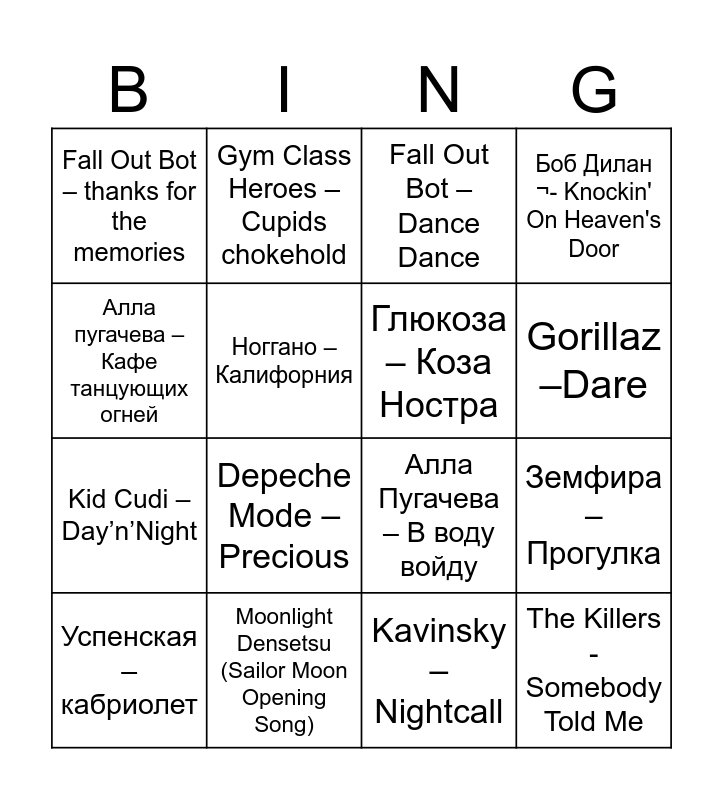 This bingo card has 16 words: Moonlight Densetsu (Sailor Moon Opening Song), Земфира – Прогулка, Fall Out Bot – Dance Dance, Fall Out Bot – thanks for the memories, Kid Cudi – Day’n’Night, Gym Class Heroes – Cupids chokehold, Алла Пугачева – В воду войду, Kavinsky – Nightcall, Алла пугачева – Кафе танцующих огней, Ноггано – Калифорния, Успенская – кабриолет, Боб Дилан ¬- Knockin' On Heaven's Door, Depeche Mode – Precious, Gorillaz –Dare, Глюкоза – Коза Ностра and The Killers - Somebody Told Me.