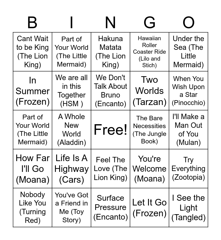 This bingo card has a free space and 24 words: Life Is A Highway (Cars), You've Got a Friend in Me (Toy Story), We Don't Talk About Bruno (Encanto), Nobody Like You (Turning Red), Under the Sea (The Little Mermaid), Cant Wait to be King (The Lion King), In Summer (Frozen), Part of Your World (The Little Mermaid), The Bare Necessities (The Jungle Book), Feel The Love (The Lion King), Two Worlds (Tarzan), Part of Your World (The Little Mermaid), You're Welcome (Moana), Try Everything (Zootopia), We are all in this Together (HSM ), Let It Go (Frozen), I'll Make a Man Out of You (Mulan), Hakuna Matata (The Lion King), When You Wish Upon a Star (Pinocchio), A Whole New World (Aladdin), I See the Light (Tangled), How Far I'll Go (Moana), Hawaiian Roller Coaster Ride (Lilo and Stich) and Surface Pressure (Encanto).