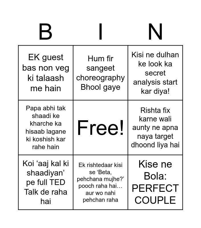 This bingo card has a free space and 20 words: Ek chota bacha Stage par chadh gaya hai, Koi Utaar do, Most asked question: Beta tumhara number kab ayega, Kisi ne dulhan ke look ka secret analysis start kar diya!, kitna he smile please bolo - Ek uncle photo me serious face bana ke khade honge, Kuch guests : Dinner is ready announcement ka wait kar rahe, Kise ne Bola: PERFECT COUPLE, Camera wale bhaiya, Humari Photo lena, EK guest bas non veg ki talaash me hain, Mummy ke aansun toh Ruk he nahi rahe hain, Hum fir sangeet choreography Bhool gaye, Rishta fix karne wali aunty ne apna naya target dhoond liya hai, Koi ‘aaj kal ki shaadiyan’ pe full TED Talk de raha hai, Rishta fix karne wali aunty ne apna naya target dhoond liya hai, EK guest bas non veg ki talaash me hain, Koi ‘aaj kal ki shaadiyan’ pe full TED Talk de raha hai, Kise kone me toh secret gossip session chalu hai, Ek rishtedaar kisi se ‘Beta, pehchana mujhe?’ pooch raha hai… aur wo nahi pehchan raha, Papa abhi tak shaadi ke kharche ka hisaab lagane ki koshish kar rahe hain, Rishta fix karne wali aunty ne apna naya target dhoond liya hai and Papa abhi tak shaadi ke kharche ka hisaab lagane ki koshish kar rahe hain.