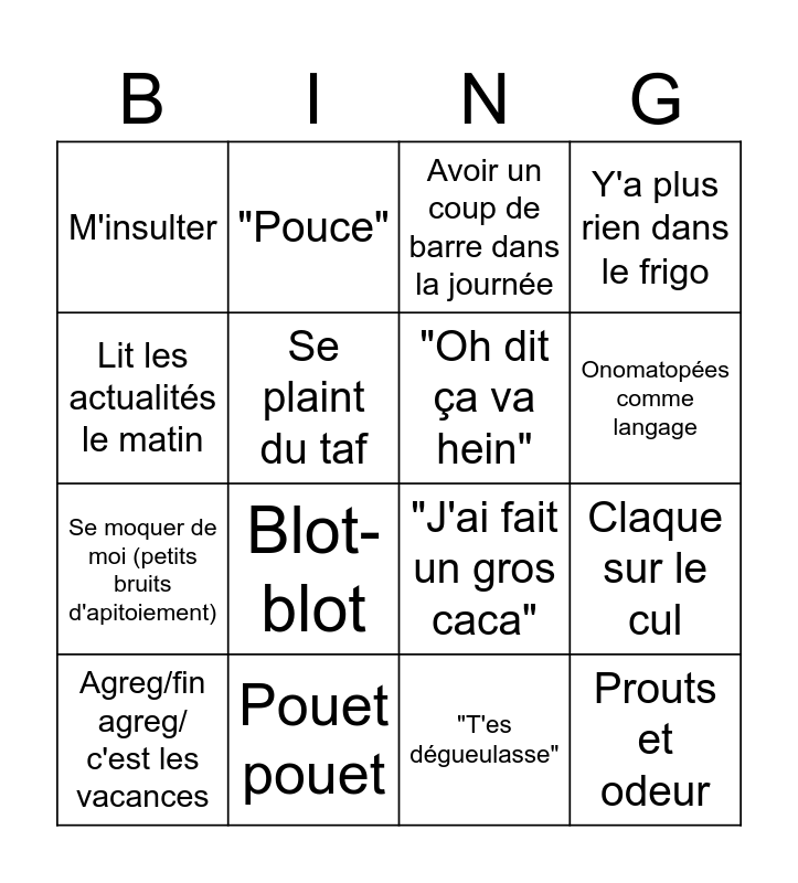 This bingo card has 16 words: Pouet pouet, Claque sur le cul, Avoir un coup de barre dans la journée, M'insulter, Se moquer de moi (petits bruits d'apitoiement), "Pouce", "J'ai fait un gros caca", "T'es dégueulasse", Lit les actualités le matin, Se plaint du taf, Agreg/fin agreg/ c'est les vacances, Y'a plus rien dans le frigo, Blot-blot, Onomatopées comme langage, "Oh dit ça va hein" and Prouts et odeur.