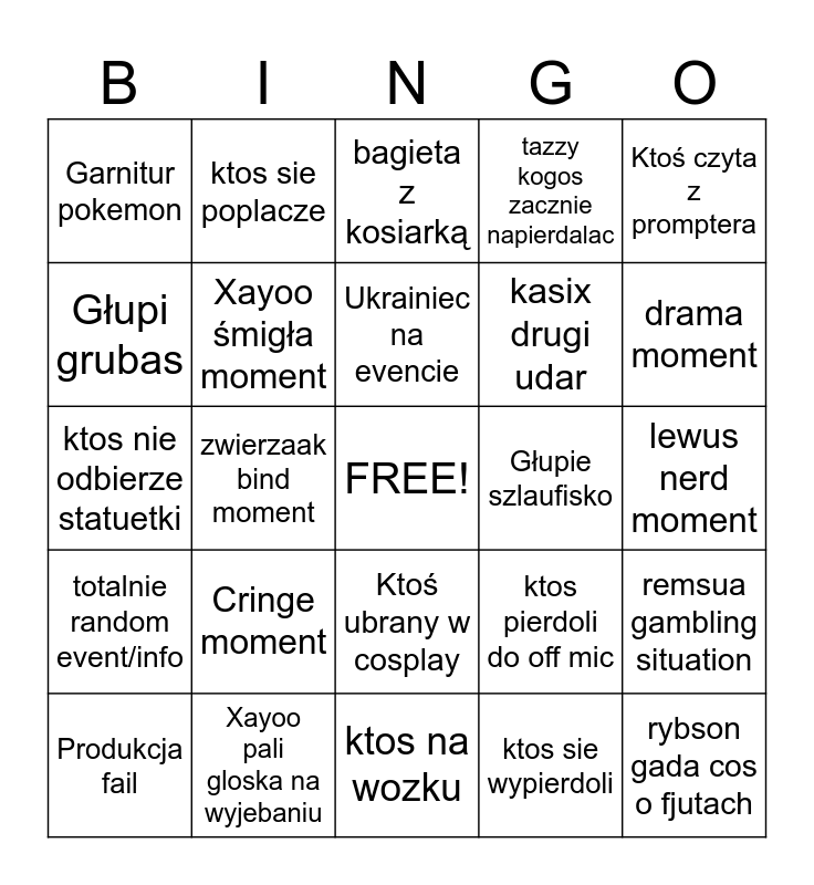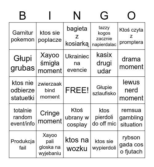 This bingo card has a free space and 24 words: Cringe moment, Xayoo pali gloska na wyjebaniu, Ukrainiec na evencie, Produkcja fail, Ktoś czyta z promptera, Garnitur pokemon, Głupi grubas, ktos sie poplacze, Głupie szlaufisko, Ktoś ubrany w cosplay, kasix drugi udar, ktos nie odbierze statuetki, ktos pierdoli do off mic, remsua gambling situation, Xayoo śmigła moment, ktos sie wypierdoli, lewus nerd moment, bagieta z kosiarką, drama moment, zwierzaak bind moment, rybson gada cos o fjutach, totalnie random event/info, tazzy kogos zacznie napierdalac and ktos na wozku.