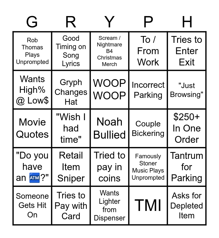 This bingo card has a free space and 54 words: "First time", "Do you have an 🏧?", Hats mentioned, Stands in wrong line, Tried to pay in coins, No tip?, To / From Work, Makes a Short-Story Long, Wants High% @ Low$, Wrong door exit, Rob Thomas Plays Unprompted, Changes Mind last Second, Tries to Pay with Card, Someone Gets Hit On, Goes to Accessories Side for Product, Wants Lighter from Dispenser, Asks for Depleted Item, Incorrect Parking, Customer Calls Out Own Annoying Behavior, $250+ In One Order, Famously Stoner Music Plays Unprompted, Talk of Weather, Couple Bickering, Tries to Enter Exit, ATM Guy Visit, Good Timing on Song Lyrics, Load Trigger in Seat, DING DING DING, Walks Over to Awkwardness, TMI, Gamer Merch, "Bad at Math", "Doesn't" Need a Menu, Expired ID, Scream / Nightmare B4 Christmas Merch, "How'dy!", Movie Quotes, Tantrum for Parking, Bhri "Zoomies" 5x, Gryph Changes Hat, Justine Exlaims a Name, Noah Drinking Rockstar, "Too Dark", Menu Speed Complaint, Retail Item Sniper, Attempt to Bypass ID Station, No Business for 1 Hour, Tires Screech, WOOP WOOP, "Wish I had time", "Just Browsing", "Must be free!" 😤, Appologises for Tip Amount and Float Highest Tip Ratio.
