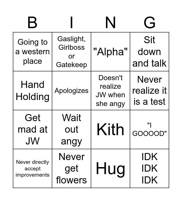 This bingo card has 16 words: Never get flowers, "I GOOOOD", "Alpha", Going to a western place, Get mad at JW, Gaslight, Girlboss or Gatekeep, Kith, Hug, Hand Holding, Apologizes, Never directly accept improvements, Sit down and talk, Wait out angy, Never realize it is a test, Doesn't realize JW when she angy and IDK IDK IDK.