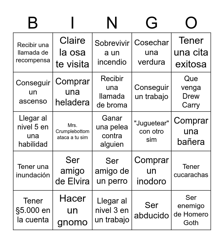 This bingo card has 25 words: Ser amigo de Elvira, Llegar al nivel 3 en un trabajo, Recibir una llamada de broma, Tener §5.000 en la cuenta, Tener una cita exitosa, Recibir una llamada de recompensa, Conseguir un ascenso, Claire la osa te visita, "Juguetear" con otro sim, Ser amigo de un perro, Conseguir un trabajo, Llegar al nivel 5 en una habilidad, Comprar un inodoro, Tener cucarachas, Comprar una heladera, Ser enemigo de Homero Goth, Comprar una bañera, Sobrevivir a un incendio, Que venga Drew Carry, Mrs. Crumplebottom ataca a tu sim, Ganar una pelea contra alguien, Hacer un gnomo, Tener una inundación, Cosechar una verdura and Ser abducido.