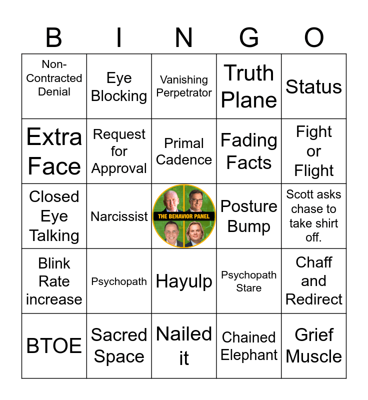 This bingo card has a free space and 28 words: Chaff and Redirect, Word Salad, Fading Facts, Chained Elephant, Extra Face, Vanishing Perpetrator, Eye Blocking, Blink Rate increase, Posture Bump, BTOE, Closed Eye Talking, Truth Plane, Sacred Space, Nailed it, Fight or Flight, Tiger's Milk, Psychopath, Request for Approval, Primal Cadence, Hayulp, Non-Contracted Denial, Peach Sniff, Grief Muscle, Narcissist, Scott asks chase to take shirt off., Psychopath Stare, Status and Organism Does.