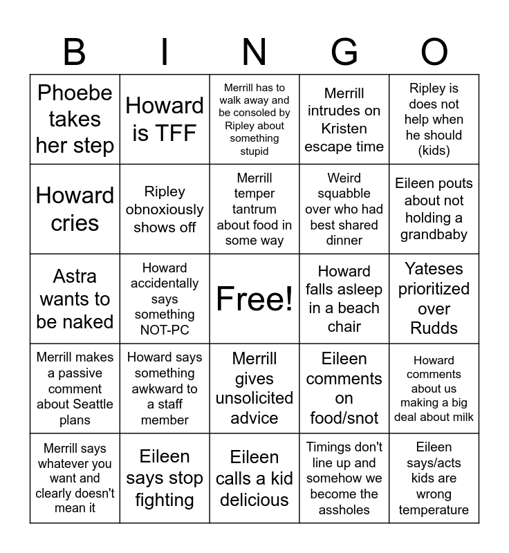 This bingo card has a free space and 24 words: Howard says something awkward to a staff member, Eileen says stop fighting, Merrill temper tantrum about food in some way, Merrill says whatever you want and clearly doesn't mean it, Ripley is does not help when he should (kids), Phoebe takes her step, Howard cries, Howard is TFF, Howard falls asleep in a beach chair, Merrill gives unsolicited advice, Weird squabble over who had best shared dinner, Astra wants to be naked, Eileen comments on food/snot, Howard comments about us making a big deal about milk, Ripley obnoxiously shows off, Timings don't line up and somehow we become the assholes, Yateses prioritized over Rudds, Merrill has to walk away and be consoled by Ripley about something stupid, Eileen pouts about not holding a grandbaby, Howard accidentally says something NOT-PC, Eileen says/acts kids are wrong temperature, Merrill makes a passive comment about Seattle plans, Merrill intrudes on Kristen escape time and Eileen calls a kid delicious.