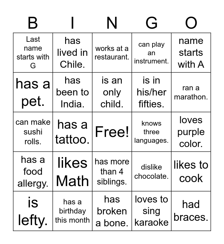 This bingo card has a free space and 24 words: likes Math, has a birthday this month, is an only child., is lefty., name starts with A, Last name starts with G, has a pet., has lived in Chile., knows three languages., has more than 4 siblings., is in his/her fifties., can make sushi rolls., dislike chocolate., likes to cook, has been to India., loves to sing karaoke, loves purple color., works at a restaurant., ran a marathon., has a tattoo., had braces., has a food allergy., can play an instrument. and has broken a bone..