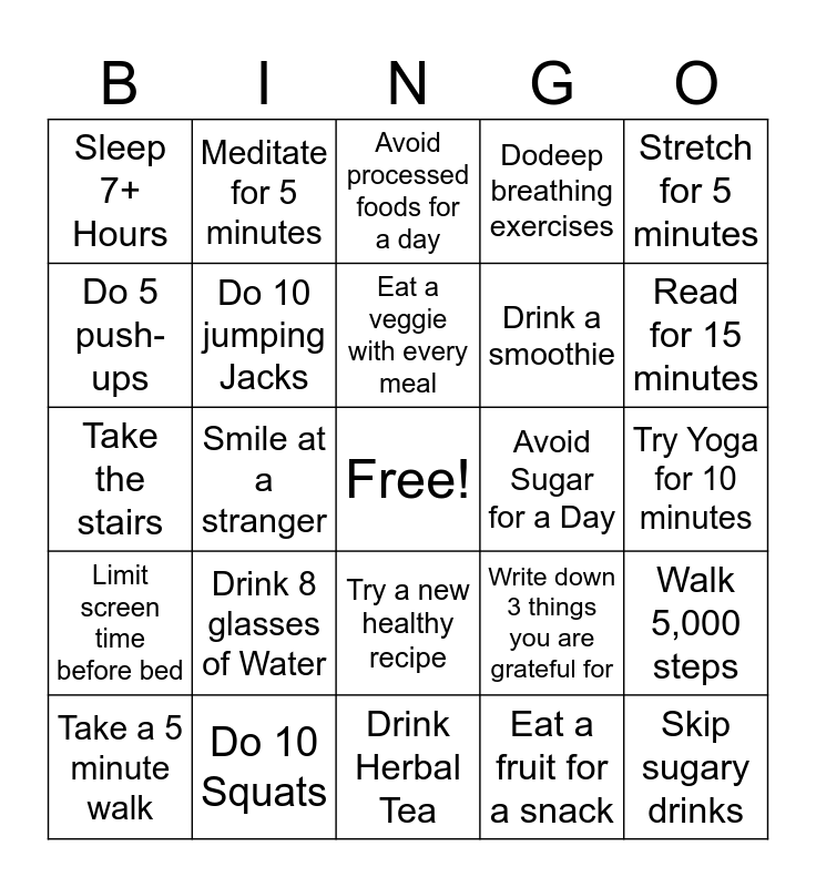 This bingo card has a free space and 24 words: Drink 8 glasses of Water, Do 10 Squats, Eat a veggie with every meal, Take a 5 minute walk, Stretch for 5 minutes, Sleep 7+ Hours, Do 5 push-ups, Meditate for 5 minutes, Avoid Sugar for a Day, Try a new healthy recipe, Drink a smoothie, Take the stairs, Write down 3 things you are grateful for, Walk 5,000 steps, Do 10 jumping Jacks, Eat a fruit for a snack, Try Yoga for 10 minutes, Avoid processed foods for a day, Read for 15 minutes, Smile at a stranger, Skip sugary drinks, Limit screen time before bed, Dodeep breathing exercises and Drink Herbal Tea.
