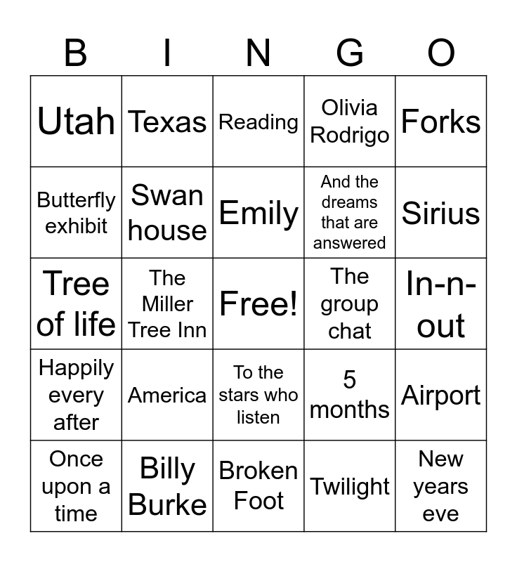 This bingo card has a free space and 24 words: Once upon a time, America, Emily, Twilight, Forks, Utah, Texas, Reading, The group chat, In-n-out, Tree of life, Swan house, 5 months, Airport, Butterfly exhibit, Billy Burke, Broken Foot, Olivia Rodrigo, Sirius, Happily every after, The Miller Tree Inn, To the stars who listen, And the dreams that are answered and New years eve.