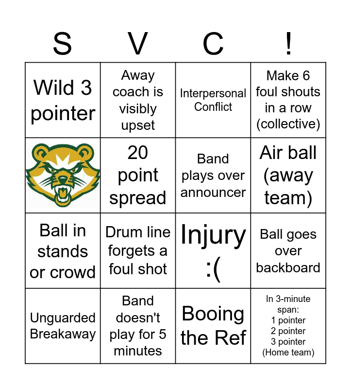 This bingo card has 1 images and 15 words: Band doesn't play for 5 minutes, Ball goes over backboard, Interpersonal Conflict, Wild 3 pointer, Ball in stands or crowd, Away coach is visibly upset, Injury :(, Booing the Ref, 20 point spread, Unguarded Breakaway, Make 6 foul shouts in a row (collective), Drum line forgets a foul shot, Air ball (away team), Band plays over announcer and In 3-minute span: 1 pointer 2 pointer 3 pointer (Home team).