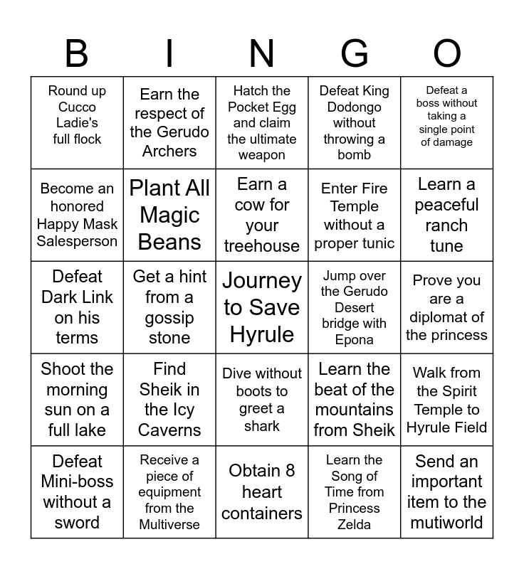 This bingo card has a free space and 29 words: Defeat Mini-boss without a sword, Talk to Dampe in the graveyard (Not under it), Get a hint from a gossip stone, Defeat Deku Scrub without a sheild, Round up Cucco Ladie's full flock, Hatch the Pocket Egg and claim the ultimate weapon, Plant All Magic Beans, Find Sheik in the Icy Caverns, Jump over the Gerudo Desert bridge with Epona, Receive a piece of equipment from the Multiverse, Prove you are a diplomat of the princess, Send an important item to the mutiworld, Obtain 8 heart containers, Learn the Song of Time from Princess Zelda, Learn a peaceful ranch tune, Hold as many rupees as possible, Dive without boots to greet a shark, Shoot the morning sun on a full lake, Defeat a boss without taking a single point of damage, Defeat Dark Link on his terms, Learn the beat of the mountains from Sheik, Help a band of frogs grow to their full potential, Enter Fire Temple without a proper tunic, Become an honored Happy Mask Salesperson, Defeat King Dodongo without throwing a bomb, Earn the respect of the Gerudo Archers, Walk from the Spirit Temple to Hyrule Field, Earn a cow for your treehouse and Obtain all Spiritual Medallions.