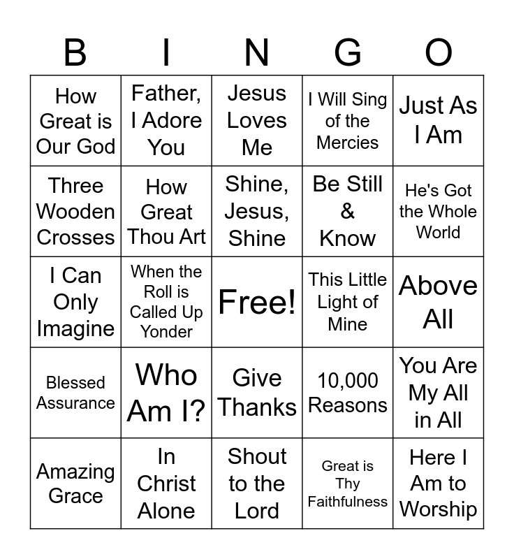 This bingo card has a free space and 33 words: In the Garden, He Lives, When the Roll is Called Up Yonder, Thy Word, Blessed Assurance, How Great Thou Art, Just As I Am, Amazing Grace, Father, I Adore You, I Will Enter His Gates, Shine, Jesus, Shine, Jesus Loves Me, I've Got the Joy, Joy, Joy, Jesus Loves the Little Children, This Little Light of Mine, He's Got the Whole World, In Christ Alone, I Can Only Imagine, Who Am I?, 10,000 Reasons, Give Thanks, You Make Everything Beautiful, How Great is Our God, Above All, Shout to the Lord, Here I Am to Worship, I Will Sing of the Mercies, Be Still & Know, Three Wooden Crosses, You Are My All in All, O Holy Night, Great is Thy Faithfulness and You Shall Go Out With Joy.