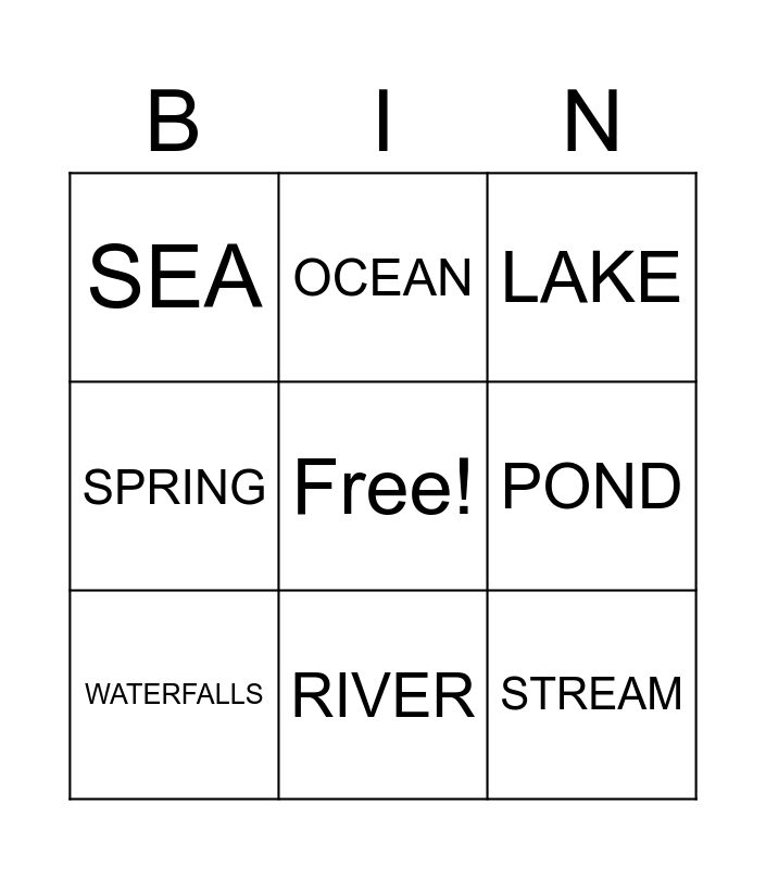 This bingo card has a free space and 8 words: POND, LAKE, OCEAN, WATERFALLS, SEA, STREAM, SPRING and RIVER.