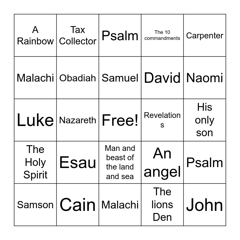 This bingo card has a free space and 24 words: Esau, Cain, Samuel, Samson, Carpenter, A Rainbow, Malachi, Tax Collector, Revelation s, Man and beast of the land and sea, David, Luke, An angel, Psalm, Obadiah, The lions Den, His only son, Psalm, Naomi, Nazareth, John, The Holy Spirit, The 10 commandments and Malachi.