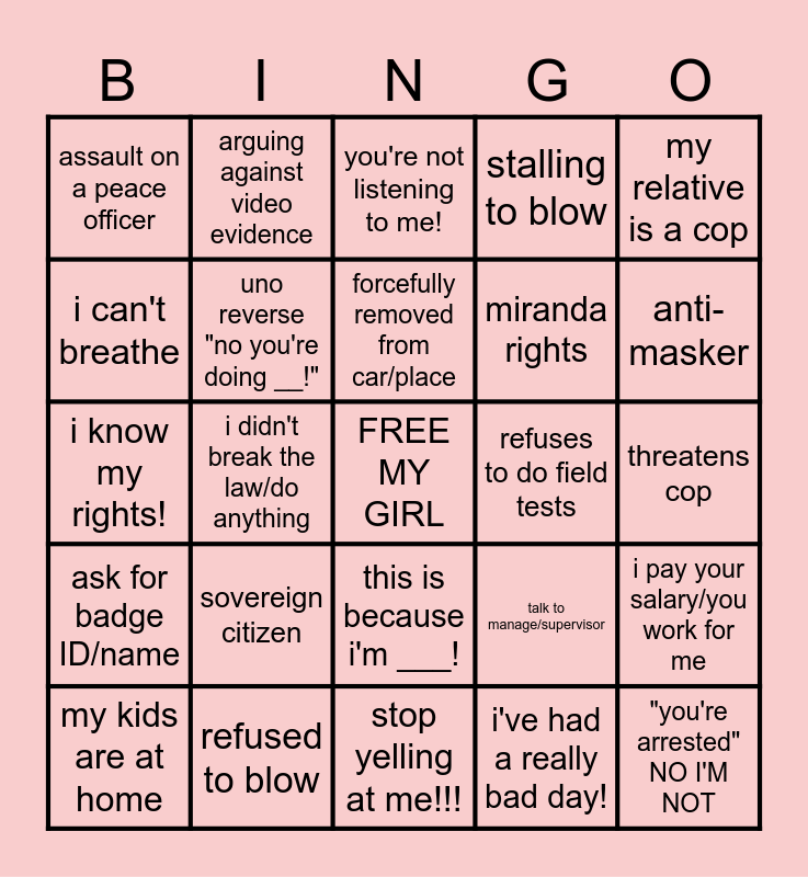 This bingo card has a free space and 43 words: i don't have time for this, "you're arrested" NO I'M NOT, i'm going to sue you, my kids are at home, i have to do (something)!, i've had a really bad day!, you're not listening to me!, "i'll do anything" ;), my relative is a cop, refused to blow, stalling to blow, refuses to do field tests, this is because i'm ___!, sovereign citizen, smells like alcohol, stop yelling at me!!!, don't touch me!, i know my rights!, calling the cops on the cops, anti-masker, arguing against video evidence, i'm not drunk (clearly drunk), has warrants, assault on a peace officer, "i'm not resisting" as they resist, threatens cop, doesn't leave when they could leave, these are uncomfortable (when cuffed), talk to manage/supervisor, ask for badge ID/name, won't identify themselves, i pay your salary/you work for me, I'M the victim!, i didn't break the law/do anything, i have rights!, tasers get pulled out, says slur, forcefully removed from car/place, i can't breathe, miranda rights, my lawyer/attorney mentioned, uno reverse "no you're doing __!" and tries to bite/bites.