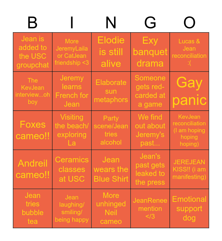 This bingo card has 25 words: Ceramics classes at USC, More unhinged Neil cameo, Elaborate sun metaphors, Jean tries bubble tea, Lucas & Jean reconciliation :(, Jean is added to the USC groupchat, The KevJean interview...oh boy, More JeremyLaila or CatJean friendship <3, We find out about Jeremy's past..., Jean wears the Blue Shirt, Someone gets red-carded at a game, Foxes cameo!!, Jean's past gets leaked to the press, JEREJEAN KISS!! (i am manifesting), Jeremy learns French for Jean, Emotional support dog, KevJean reconciliation (I am hoping hoping hoping), Elodie is still alive, Gay panic, Visiting the beach/ exploring La, Party scene/Jean tries alcohol, Jean laughing/ smiling/ being happy, Andreil cameo!!, Exy banquet drama and JeanRenee mention </3.