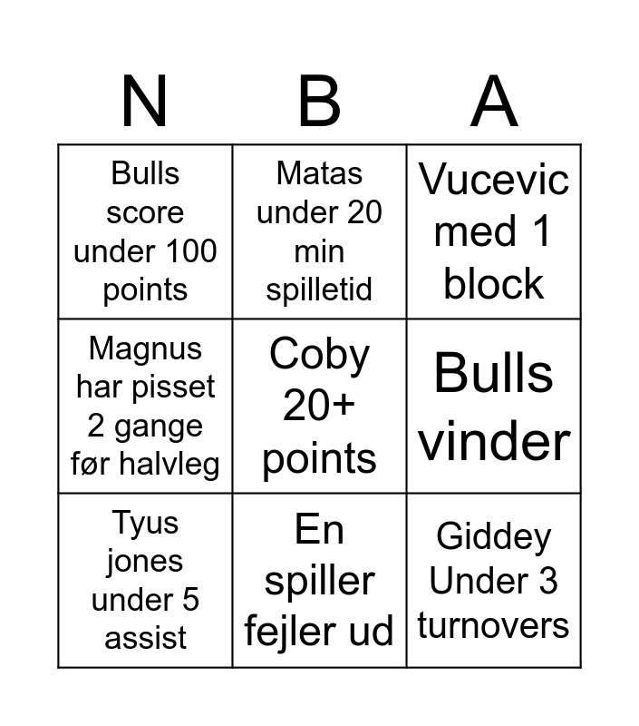 This bingo card has a free space and 8 words: Bulls vinder, Vucevic med 1 block, Matas under 20 min spilletid, Tyus jones under 5 assist, Bulls score under 100 points, Giddey Under 3 turnovers, Magnus har pisset 2 gange før halvleg and En spiller fejler ud.