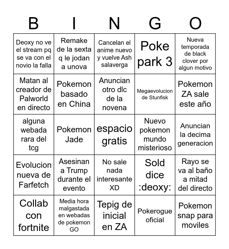 This bingo card has a free space and 24 words: Asesinan a Trump durante el evento, Media hora malgastada en webadas de pokemon GO, Anuncian otro dlc de la novena, Collab con fortnite, Nueva temporada de black clover por algun motivo, Deoxy no ve el stream pq se va con el novio la falla, Matan al creador de Palworld en directo, Remake de la sexta q le jodan a unova, Nuevo pokemon mundo misterioso, No sale nada interesante XD, Megaevolucion de Stunfisk, alguna webada rara del tcg, Sold dice :deoxy:, Rayo se va al baño a mitad del directo, Pokemon basado en China, Pokerogue oficial, Anuncian la decima generacion, Cancelan el anime nuevo y vuelve Ash salaverga, Pokemon ZA sale este año, Pokemon Jade, Pokemon snap para moviles, Evolucion nueva de Farfetch, Poke park 3 and Tepig de inicial en ZA.