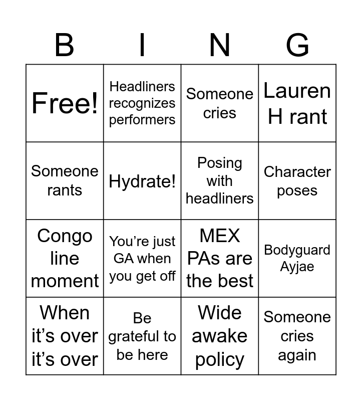 This bingo card has 16 words: When it’s over it’s over, Be grateful to be here, Someone cries, Lauren H rant, Someone rants, Headliners recognizes performers, MEX PAs are the best, Bodyguard Ayjae, Free!, Hydrate!, Wide awake policy, Character poses, Congo line moment, You’re just GA when you get off, Posing with headliners and Someone cries again.