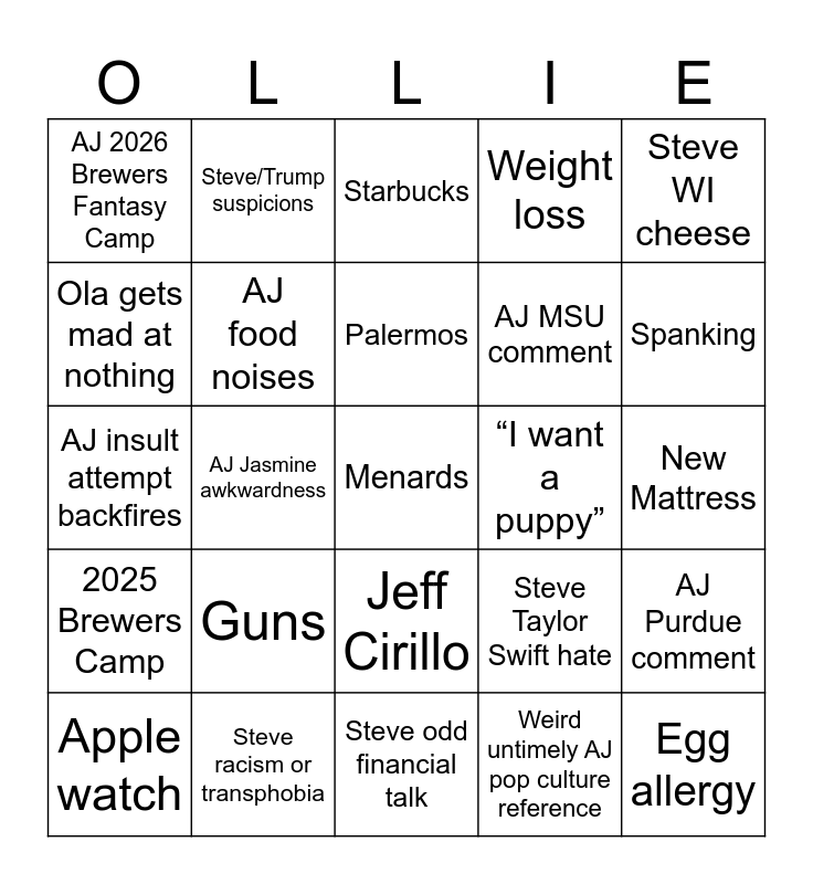 This bingo card has a free space and 24 words: Guns, Steve racism or transphobia, Palermos, Apple watch, Steve WI cheese, AJ 2026 Brewers Fantasy Camp, Ola gets mad at nothing, Steve/Trump suspicions, “I want a puppy”, Jeff Cirillo, AJ MSU comment, AJ insult attempt backfires, Steve Taylor Swift hate, AJ Purdue comment, AJ food noises, Weird untimely AJ pop culture reference, New Mattress, Starbucks, Spanking, AJ Jasmine awkwardness, Egg allergy, 2025 Brewers Camp, Weight loss and Steve odd financial talk.
