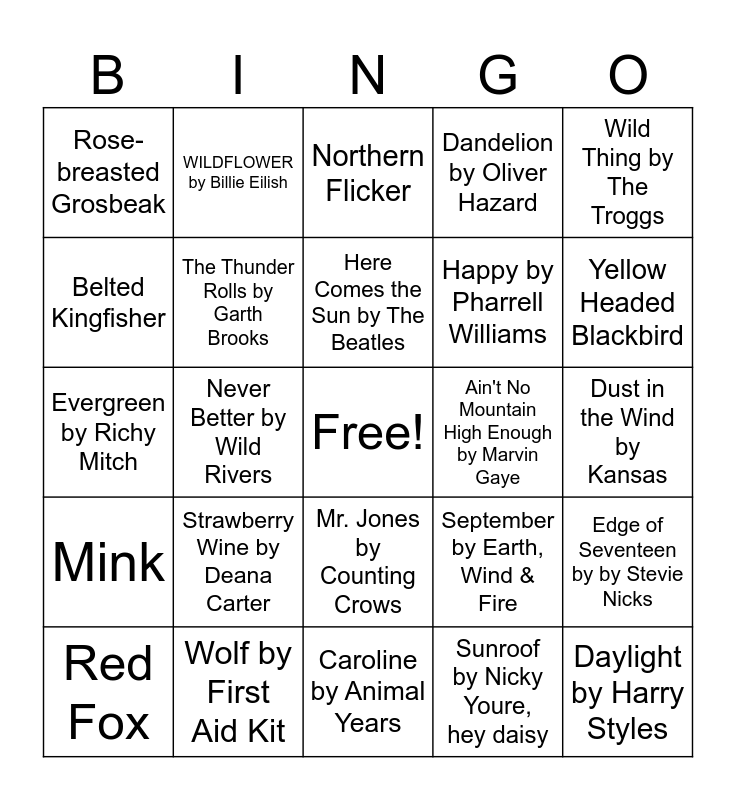 This bingo card has a free space and 89 words: Hymn for the Weekend by Coldplay, Welcome to the Jungle by Guns N' Roses, Mr. Jones by Counting Crows, Bad Moon Rising by Creedance Clearwater Revival, Snow (Hey Oh) by Red Hot Chili Peppers, Hotel California by Eagles, House of the Rising Sun by The Animals, Free Bird by Lynyrd Skynyrd, Purple Rain by Prince, Rock You Like a Hurricane by Scorpions, The Reaper by Blue Oyster Cult, Birding by Swet Shop Boys, Edge of Seventeen by by Stevie Nicks, Dust in the Wind by Kansas, Ocean Eyes by Billie Eilish, Here Comes the Sun by The Beatles, A Sky Full of Stars by Coldplay, Rocky Mountain High by John Denver, Three Little Birds by Bob Marley, Fireflies by Owl City, Barracuda by Heart, Old Pine by Ben Howard, Caroline by Animal Years, The Bird Song by Noah Floersch, Evergreen by Richy Mitch, Wolf by First Aid Kit, Waterfalls by TLC, Day'N'Nite by Kid Cudi, Do I Wanna Know? by Artic Monkeys, Shake the Frost by Tyler Childers, Dandelion by Oliver Hazard, Never Better by Wild Rivers, Northern Cardinal, Rose-breasted Grosbeak, Whip-poor-will, Northern Flicker, Belted Kingfisher, Sandhill Crane, Yellow Headed Blackbird, Red Fox, Mink, Rattle Snake, Coyote, Hip Hop Hooray by Naughty by Nature, September by Earth, Wind & Fire, Ain't No Mountain High Enough by Marvin Gaye, Have You Seen the Rain by Creedance Clearwater Revival, Take it Easy by Eagles, We Didn't Start the Fire by Billy Joel, WILDFLOWER by Billie Eilish, Shrike by Hozier, Swan Upon Leda by Hozier, California Sunrise by Jon Pardi, Never Seen the Rain by Tones And I, House Wren, Red Winged Blackbird, Western Meadowlark, American Toad, Red-tailed Hawk, Field Sparrow, Cope’s Gray Tree Frog, Barred Owl, Walking on Sunshine by Katrina & The Waves, Pontoon by Little Big Town, Thunder by Imagine Dragons, I’m Gonna Miss Her by Brad Paisley, Riptide by Vance Joy, Eye of the Tiger by Survivor, Timber by Pitbull, Ke$ha, Strawberry Wine by Deana Carter, Daylight by Harry Styles, Bluebird by Miranda Lambert, County Stars by OneRepublic, Happy by Pharrell Williams, The Thunder Rolls by Garth Brooks, Sunroof by Nicky Youre, hey daisy, Drops of Jupiter by Train, Gravity by John Mayer, Wildflowers by Tom Petty, Knee Deep by Zac Brown Band, Jimmy Buffett, Wild Thing by The Troggs, Constellations by Jack Johnson, Greater Prairie Chicken, What A Wonderful World by Louis Armstrong, Put Your Records On by Corinne Bailey Rae, Somewhere Over the Rainbow by Israel Kamakawiwo’ole, Big Yellow Taxi by Counting Crows, Vanessa Carlton, The Fox (What Does the Fox Say?) by Ylvis and On the Road Again by Willie Nelson.