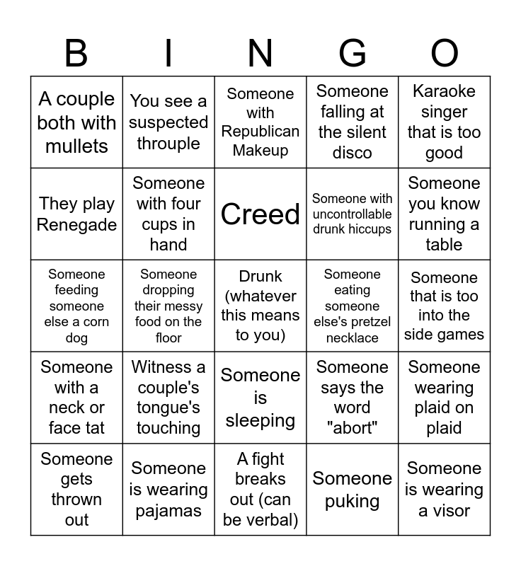 This bingo card has a free space and 24 words: Witness a couple's tongue's touching, Someone is wearing pajamas, Creed, Someone gets thrown out, Karaoke singer that is too good, A couple both with mullets, They play Renegade, You see a suspected throuple, Someone eating someone else's pretzel necklace, Someone is sleeping, Someone with uncontrollable drunk hiccups, Someone feeding someone else a corn dog, Someone says the word "abort", Someone wearing plaid on plaid, Someone with four cups in hand, Someone puking, Someone that is too into the side games, Someone with Republican Makeup, Someone you know running a table, Someone dropping their messy food on the floor, Someone is wearing a visor, Someone with a neck or face tat, Someone falling at the silent disco and A fight breaks out (can be verbal).