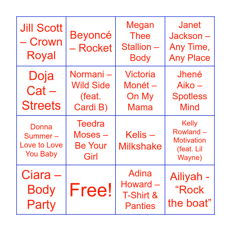 This bingo card has 21 words: Free!, Janet Jackson – Would You Mind, Beyoncé – Rocket, Floetry – Say Yes, Adina Howard – T-Shirt & Panties, Victoria Monét – On My Mama, Jill Scott – Crown Royal, Megan Thee Stallion – Body, Kelis – Milkshake, Jhené Aiko – Spotless Mind, Donna Summer – Love to Love You Baby, Janet Jackson – Any Time, Any Place, Ailiyah - “Rock the boat”, Summer Walker – Session 32, Normani – Wild Side (feat. Cardi B), Tinashe – Touch & Go (feat. 6LACK), Ciara – Body Party, Teedra Moses – Be Your Girl, Doja Cat – Streets, Kelly Rowland – Motivation (feat. Lil Wayne) and FKA twigs – Two Weeks.