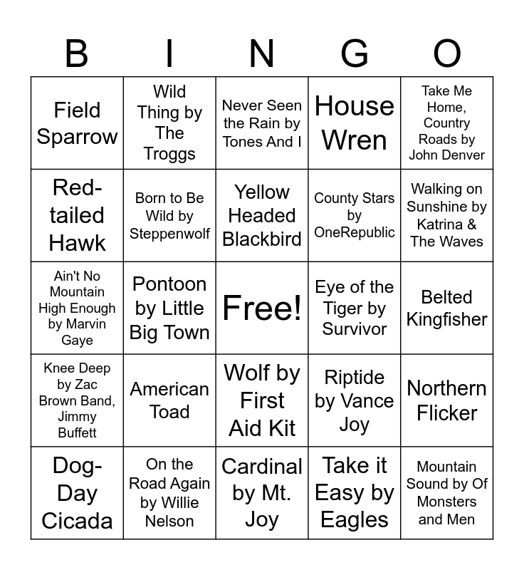 This bingo card has a free space and 88 words: The Bird Song by Noah Floersch, Evergreen by Richy Mitch, Wolf by First Aid Kit, Waterfalls by TLC, Day'N'Nite by Kid Cudi, Do I Wanna Know? by Artic Monkeys, Shake the Frost by Tyler Childers, Dandelion by Oliver Hazard, Never Better by Wild Rivers, Northern Cardinal, Rose-breasted Grosbeak, Whip-poor-will, Northern Flicker, Belted Kingfisher, Sandhill Crane, Yellow Headed Blackbird, Red Fox, Mink, Rattle Snake, Coyote, Hip Hop Hooray by Naughty by Nature, September by Earth, Wind & Fire, Ain't No Mountain High Enough by Marvin Gaye, Have You Seen the Rain by Creedance Clearwater Revival, Take it Easy by Eagles, We Didn't Start the Fire by Billy Joel, WILDFLOWER by Billie Eilish, Shrike by Hozier, Swan Upon Leda by Hozier, California Sunrise by Jon Pardi, Never Seen the Rain by Tones And I, House Wren, Red Winged Blackbird, Western Meadowlark, American Toad, Red-tailed Hawk, Field Sparrow, Cope’s Gray Tree Frog, Barred Owl, Walking on Sunshine by Katrina & The Waves, Pontoon by Little Big Town, Thunder by Imagine Dragons, I’m Gonna Miss Her by Brad Paisley, Riptide by Vance Joy, Eye of the Tiger by Survivor, Timber by Pitbull, Ke$ha, Strawberry Wine by Deana Carter, Daylight by Harry Styles, Bluebird by Miranda Lambert, County Stars by OneRepublic, Happy by Pharrell Williams, The Thunder Rolls by Garth Brooks, Sunroof by Nicky Youre, hey daisy, Drops of Jupiter by Train, Gravity by John Mayer, Wildflowers by Tom Petty, Knee Deep by Zac Brown Band, Jimmy Buffett, Wild Thing by The Troggs, Constellations by Jack Johnson, Greater Prairie Chicken, What A Wonderful World by Louis Armstrong, Put Your Records On by Corinne Bailey Rae, Somewhere Over the Rainbow by Israel Kamakawiwo’ole, Big Yellow Taxi by Counting Crows, Vanessa Carlton, The Fox (What Does the Fox Say?) by Ylvis, On the Road Again by Willie Nelson, Talking to the Moon by Bruno Mars, Born to Be Wild by Steppenwolf, Dog-Day Cicada, Mountain Sound by Of Monsters and Men, Fishin' in the Dark by Nitty Gritty Dirt Band, Red Dirt Road by Brooks & Dunn, Where the Green Grass Grows by Tim McGraw, Take Me Home, Country Roads by John Denver, Numb Little Bug by Em Beihold, Dancing in the Moonlight by King Harvest, Birds of a Feather by Billie Eilish, Wildflowers by Trampled by Turtles, Cardinal by Mt. Joy, Heat Waves by Glass Animals, One Headlight by The Wallflowers, Honeybee by The Head and the Heart, The Woods by Hollow Coves, The Oaks by All Faces, Hanginaround by Counting Crows, Blackbird by The Beatles, Hymn for the Weekend by Coldplay and Welcome to the Jungle by Guns N' Roses.