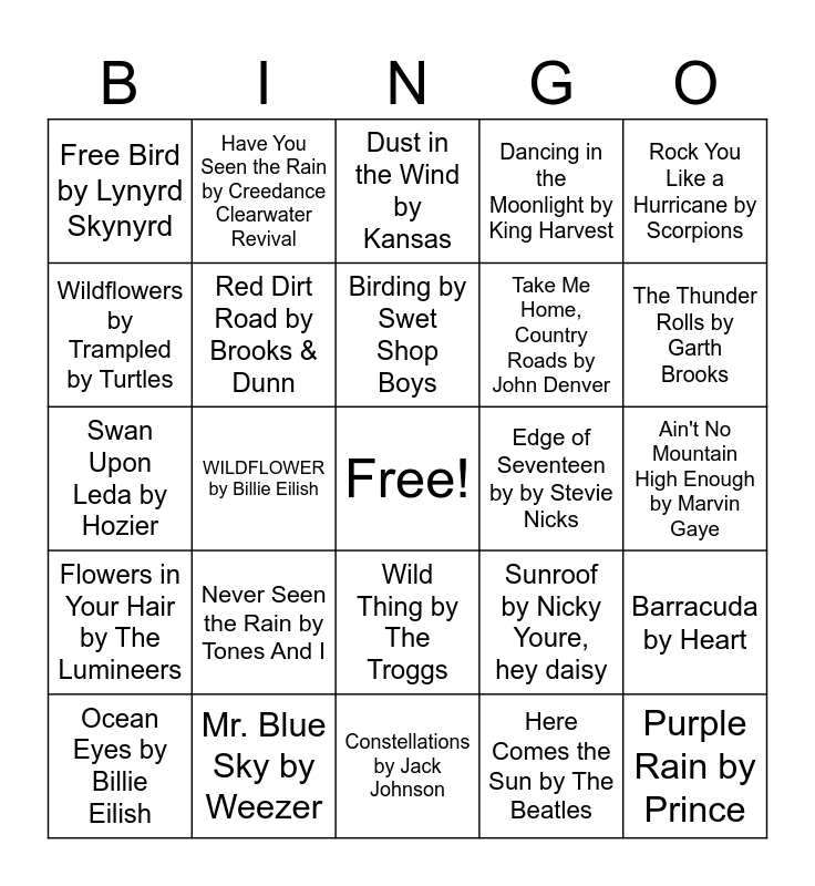 This bingo card has a free space and 62 words: Rivers and Roads by the Head and the Heart, Mr. Blue Sky by Weezer, Stick Season by Noah Kahan, Flowers in Your Hair by The Lumineers, Mountain Sound by Of Monsters and Men, Fishin' in the Dark by Nitty Gritty Dirt Band, Red Dirt Road by Brooks & Dunn, Where the Green Grass Grows by Tim McGraw, Take Me Home, Country Roads by John Denver, Numb Little Bug by Em Beihold, Dancing in the Moonlight by King Harvest, Birds of a Feather by Billie Eilish, Wildflowers by Trampled by Turtles, Hotel California by Eagles, House of the Rising Sun by The Animals, Free Bird by Lynyrd Skynyrd, Purple Rain by Prince, Rock You Like a Hurricane by Scorpions, The Reaper by Blue Oyster Cult, Birding by Swet Shop Boys, Edge of Seventeen by by Stevie Nicks, Dust in the Wind by Kansas, Ocean Eyes by Billie Eilish, Here Comes the Sun by The Beatles, A Sky Full of Stars by Coldplay, Rocky Mountain High by John Denver, Three Little Birds by Bob Marley, Fireflies by Owl City, Barracuda by Heart, Mink, Rattle Snake, Coyote, Hip Hop Hooray by Naughty by Nature, September by Earth, Wind & Fire, Ain't No Mountain High Enough by Marvin Gaye, Have You Seen the Rain by Creedance Clearwater Revival, Take it Easy by Eagles, We Didn't Start the Fire by Billy Joel, WILDFLOWER by Billie Eilish, Shrike by Hozier, Swan Upon Leda by Hozier, California Sunrise by Jon Pardi, Never Seen the Rain by Tones And I, House Wren, The Thunder Rolls by Garth Brooks, Sunroof by Nicky Youre, hey daisy, Drops of Jupiter by Train, Gravity by John Mayer, Wildflowers by Tom Petty, Knee Deep by Zac Brown Band, Jimmy Buffett, Wild Thing by The Troggs, Constellations by Jack Johnson, Greater Prairie Chicken, What A Wonderful World by Louis Armstrong, Put Your Records On by Corinne Bailey Rae, Somewhere Over the Rainbow by Israel Kamakawiwo’ole, Big Yellow Taxi by Counting Crows, Vanessa Carlton, The Fox (What Does the Fox Say?) by Ylvis, On the Road Again by Willie Nelson, Talking to the Moon by Bruno Mars, Born to Be Wild by Steppenwolf and Dog-Day Cicada.