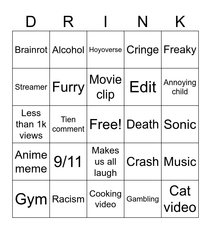 This bingo card has a free space and 24 words: 9/11, Racism, Movie clip, Gym, Freaky, Brainrot, Streamer, Alcohol, Death, Makes us all laugh, Edit, Less than 1k views, Crash, Music, Furry, Gambling, Sonic, Hoyoverse, Annoying child, Tien comment, Cat video, Anime meme, Cringe and Cooking video.