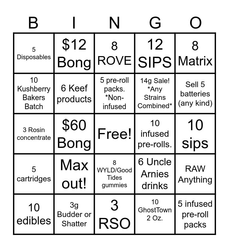 This bingo card has a free space and 24 words: Max out!, 3g Budder or Shatter, 5 pre-roll packs. *Non-infused, 10 edibles, 8 Matrix, 5 Disposables, 10 Kushberry Bakers Batch, $12 Bong, 10 infused pre-rolls., 8 WYLD/Good Tides gummies, 14g Sale! *Any Strains Combined*, 3 Rosin concentrate, 6 Uncle Arnies drinks, RAW Anything, 6 Keef products, 10 GhostTown 2 Oz., 10 sips, 8 ROVE, Sell 5 batteries (any kind), $60 Bong, 5 infused pre-roll packs, 5 cartridges, 12 SIPS and 3 RSO.