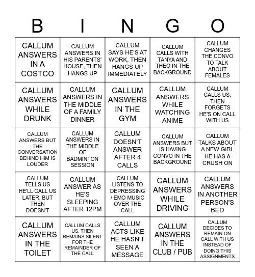 This bingo card has a free space and 24 words: CALLUM ANSWERS IN THE TOILET, CALLUM ANSWER AS HE'S SLEEPING AFTER 12PM, CALLUM ANSWERS IN THE GYM, CALLUM ANSWERS IN THE CLUB / PUB, CALLUM CHANGES THE CONVO TO TALK ABOUT FEMALES, CALLUM ANSWERS IN A COSTCO, CALLUM ANSWERS IN HIS PARENTS' HOUSE, THEN HANGS UP, CALLUM SAYS HE'S AT WORK, THEN HANGS UP IMMEDIATELY, CALLUM ANSWERS BUT IS HAVING CONVO IN THE BACKGROUND, CALLUM TALKS ABOUT A NEW GIRL HE HAS A CRUSH ON, CALLUM ANSWERS BUT THE CONVERSATION BEHIND HIM IS LOUDER, CALLUM ANSWERS IN THE MIDDLE OF A FAMILY DINNER, CALLUM ANSWERS WHILE DRIVING, CALLUM ANSWERS IN ANOTHER PERSON'S BED, CALLUM ANSWERS WHILE DRUNK, CALLUM CALLS US, THEN REMAINS SILENT FOR THE REMAINDER OF THE CALL, CALLUM ACTS LIKE HE HASN'T SEEN A MESSAGE, CALLUM CALLS WITH TANYA AND THEO IN THE BACKGROUND, CALLUM CALLS US, THEN FORGETS HE'S ON CALL WITH US, CALLUM TELLS US HE'LL CALL US LATER, BUT THEN DOESN'T, CALLUM ANSWERS IN THE MIDDLE OF BADMINTON SESSION, CALLUM LISTENS TO DEPRESSING / EMO MUSIC OVER THE CALL, CALLUM ANSWERS WHILE WATCHING ANIME and CALLUM DECIDES TO REMAIN ON CALL WITH US INSTEAD OF DOING THIS ASSIGNMENTS.