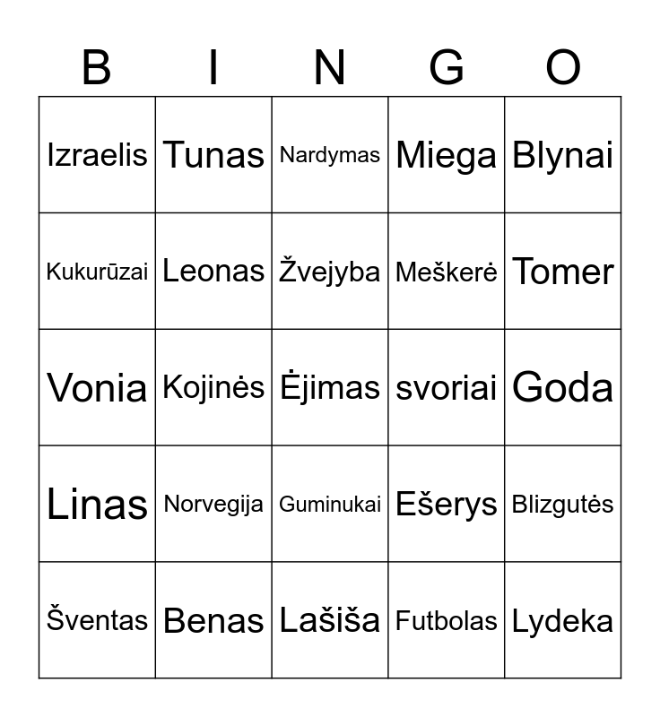 This bingo card has 27 words: Ešerys, Lydeka, Meškerė, Lašiša, Kukurūzai, Nardymas, Tunas, Linas, svoriai, Blizgutės, Vonia, Miega, Šventas, Benas, Tomer, Dekelis, Leonas, Žvejyba, Norvegija, Izraelis, Goda, Futbolas, Kojinės, Ėjimas, Guminukai, Blynai and Bananai.
